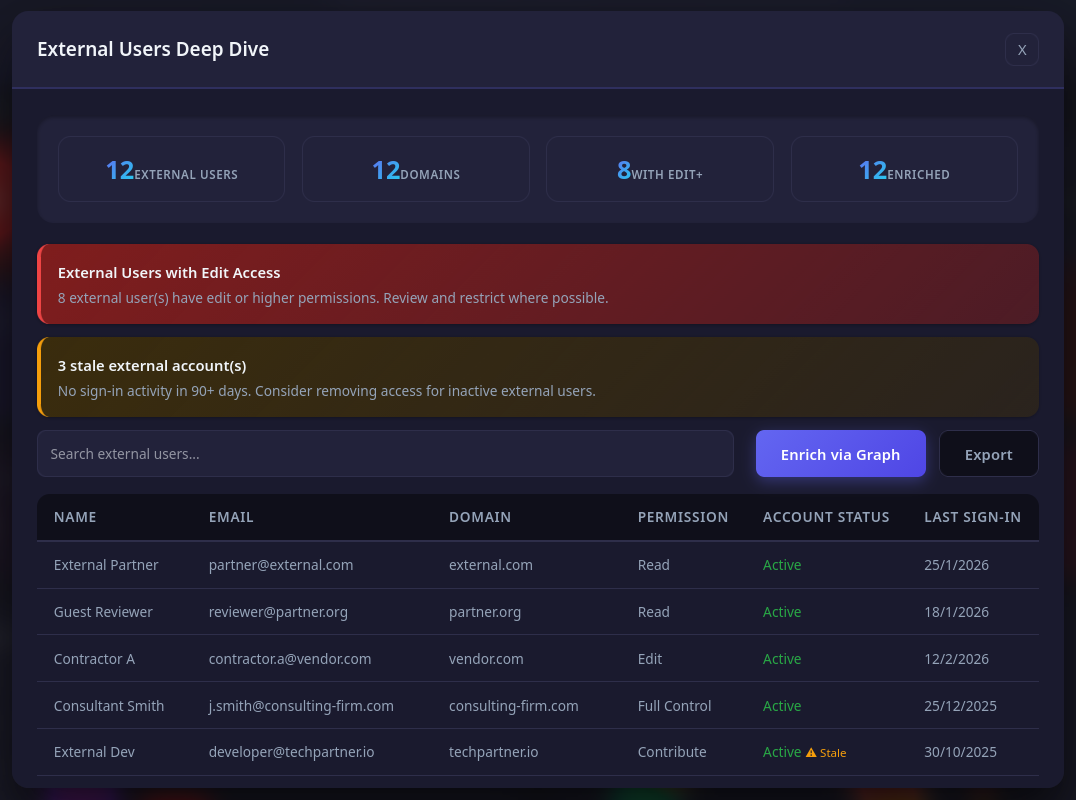 | 🟠 High | External users with elevated permissions, anonymous links, excessive Full Control, broken inheritance |