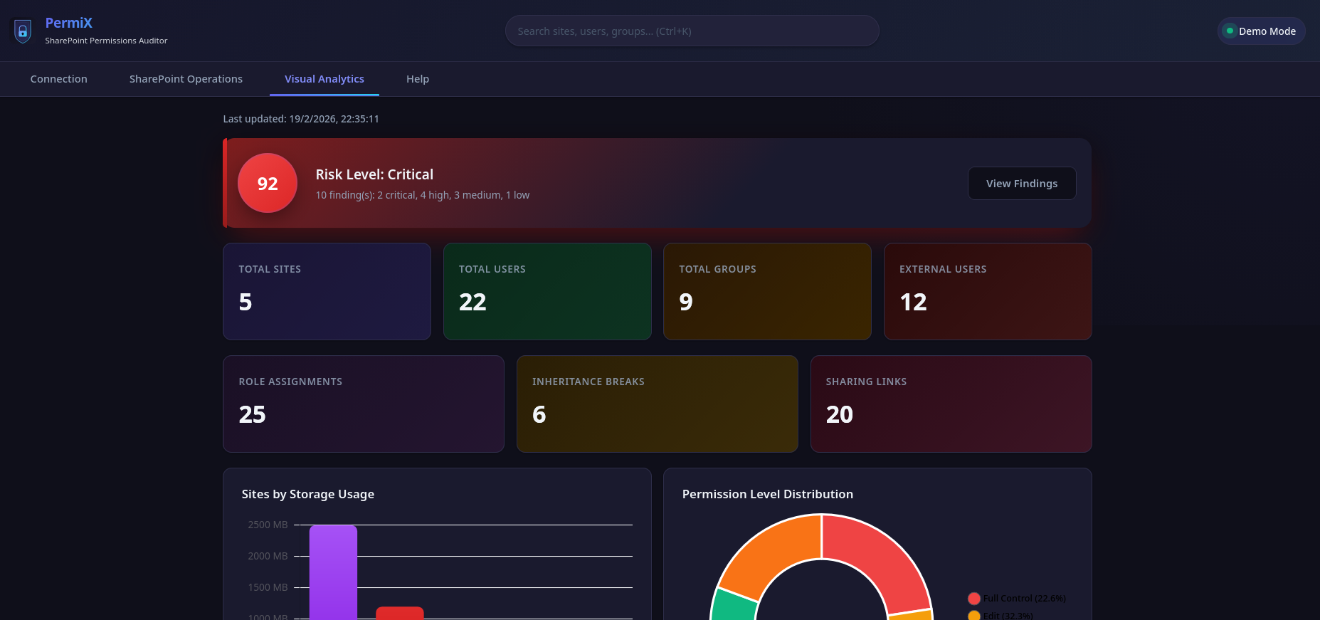 Sites.Read.All/AllSites.Readis insufficient.SharePoint Administrator role: Tenant-wide site enumeration and storage data require this role. PermiX automatically detects your permissions on connection and shows you a capability status display indicating exactly what data you can access. Non-admin users can still analyze individual sites — the tool gracefully adapts to your permission level.